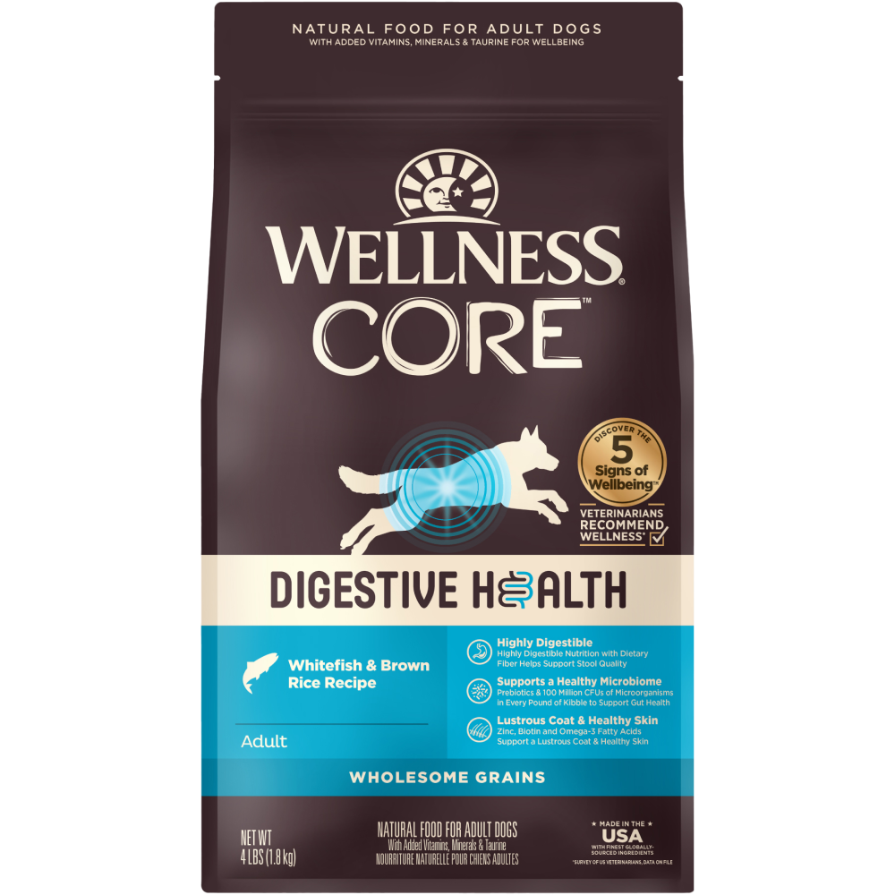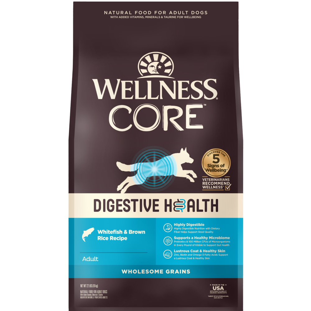 Wellness® CORE® Digestive Health Whitefish & Brown Rice Recipe is formulated to meet the nutritional levels established by the AAFCO Dog Food Nutrient Profiles for maintenance.