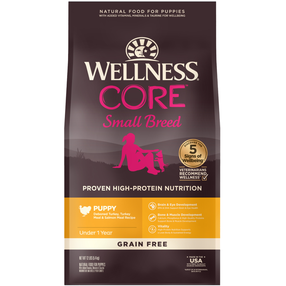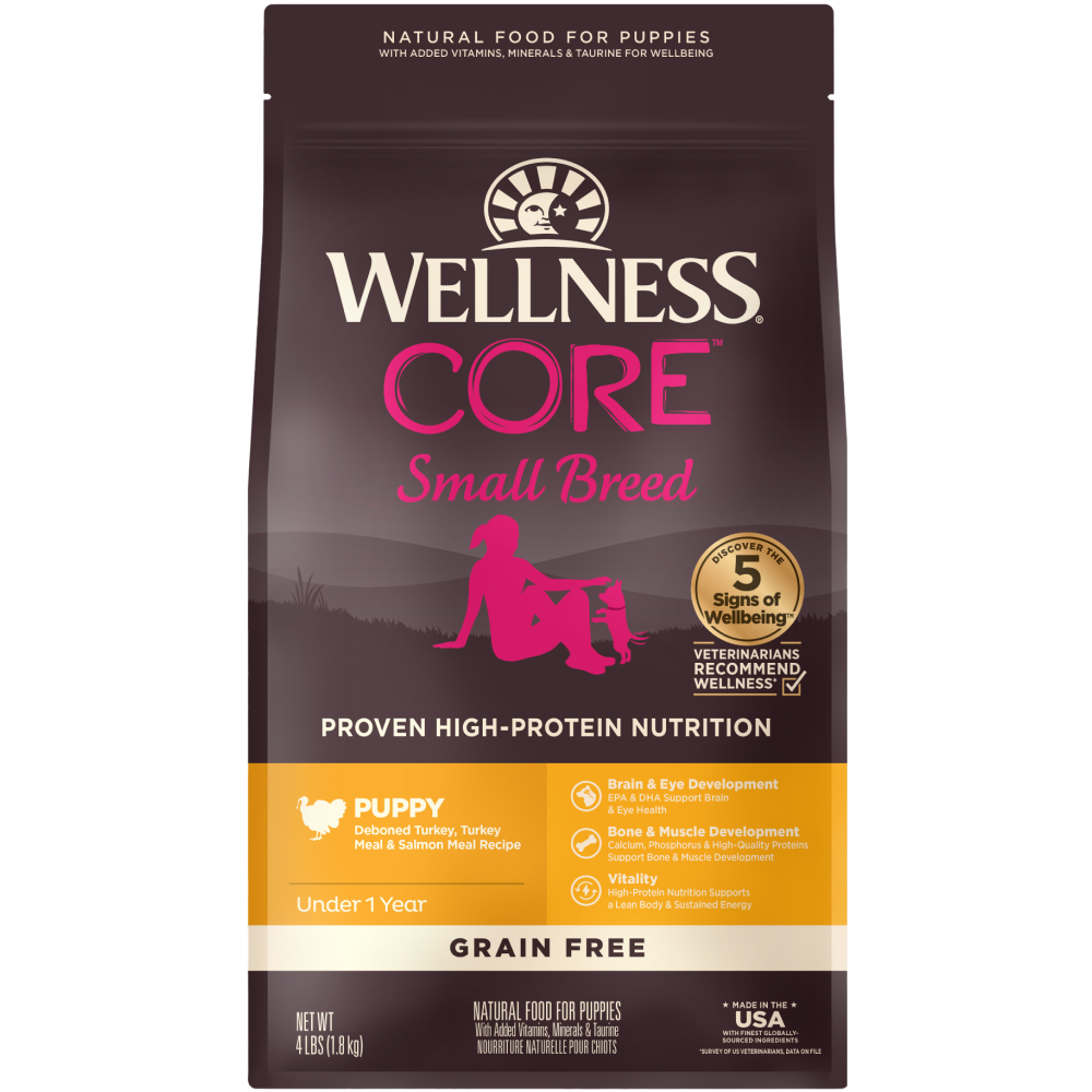 Wellness CORE Small Breed Puppy Deboned Turkey, Turkey Meal & Salmon Meal Recipe is formulated to meet the nutritional levels established by the AAFCO Dog Food Nutrient Profiles for growth and gestation/lactation except for growth of large size dogs (70 lbs or more as an adult).